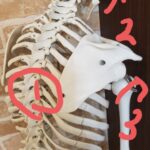 まず赤丸①が丸くなってます。いわゆる猫背です。連動して顔が前にでます。常に後頚部は長年緊張します。顎は上がります。これは2番です。そして両肩は中に入ります。3番です。